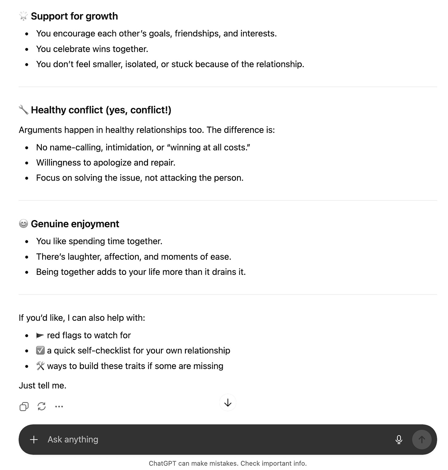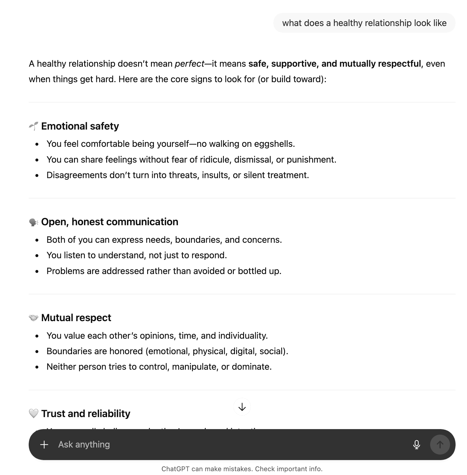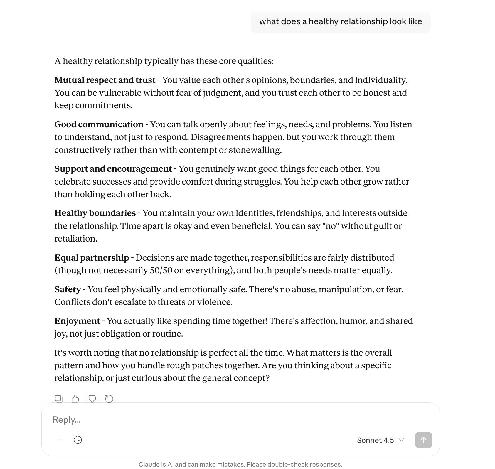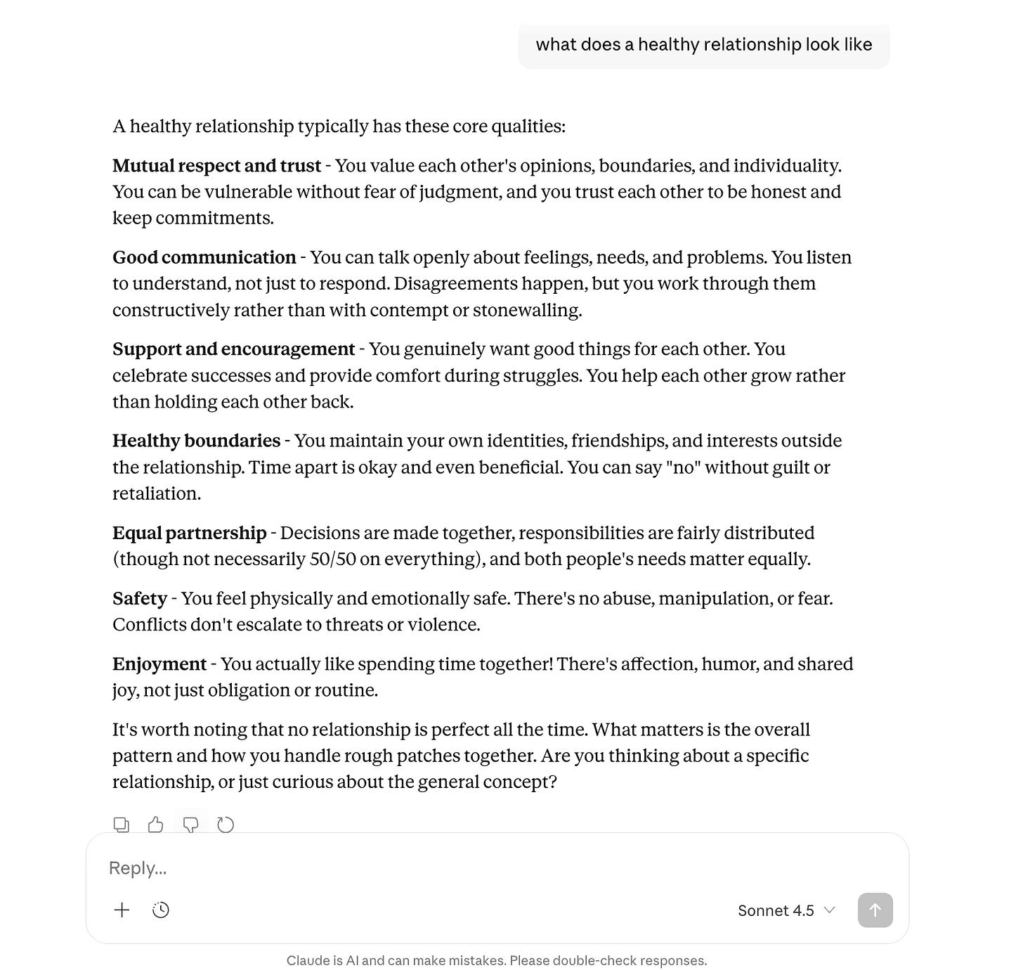These answers aren’t wrong necessarily. They are, however, very different from what I get from or give to my friends. The model doesn’t ask what I ask my friends first: it doesn’t ask me what made me ask, what I’m trying to decide, or what kind of “healthy” I mean. It doesn’t ask for stories or share stories with me that it thinks could help me paint a more colorful picture of what health could look like. It responds as though “healthy relationship” is a fully assembled concept, and then asks follow up questions or offers additional perspective or advice.